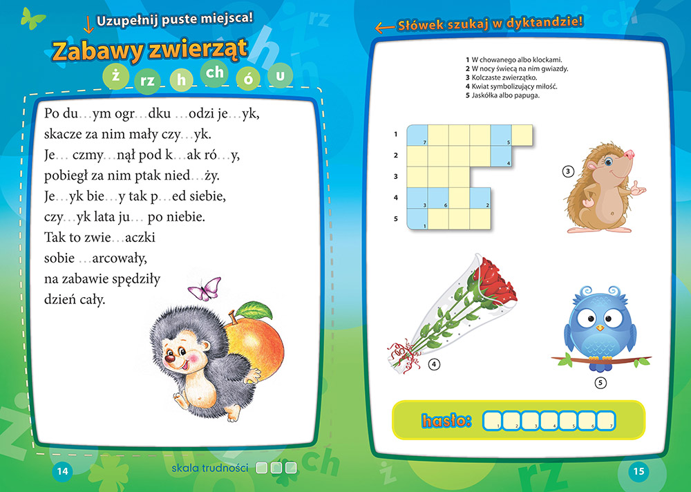 Dyktanda do uzupe³niania mo¿na ³atwo sprawdziæ za pomoc± s³owniczka zamieszczonego na koñcu ksi±¿ki, a po skoñczonej pracy - rozwi±zaæ zabawn± krzy¿ówkê. W drugiej czê¶ci ksi±¿ki znajduj± siê dyktanda do pisania ze s³uchu. Perforowane strony u³atwiaj± wyrwanie kartek. Dziêki nim mo¿na w domu æwiczyæ pisanie dyktand - dok³adnie tak, jak w szkole.