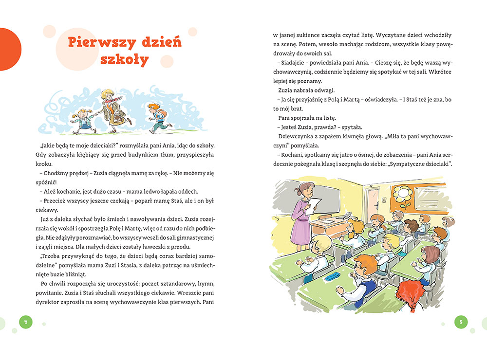 Przedstawiamy zbiór krótkich opowiadań przeznaczony dla przedszkolaków i zerówkowiczów - czyli dzieci niedługo zaczynających naukę - oraz dla uczniów klas 1-3, których szkolna przygoda trwa w najlepsze. Przez uczniowską codzienność młodych czytelników przeprowadzą bliźniaki - Staś i Zuzia oraz niezawodna i sympatyczna nauczycielka, pani Ania. Razem z nimi można przeżyć emocjonujący początek roku szkolnego, ślubowanie pierwszoklasistów, wycieczki i święta, a także obserwować bardziej zwyczajne dni uczniów i śledzić ich losy - to, jak powoli coraz lepiej są poznają i zawierają przyjaźnie.