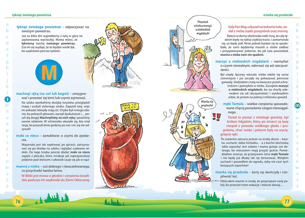 Zaradziæ temu mo¿e Ilustrowany s³ownik frazeologiczny, który powsta³ z my¶l± o uczniach szko³y podstawowej i ka¿dym, kto lubi dowiadywaæ siê nowych rzeczy, dobrze siê przy tym bawi±c. Obszerny zbiór zwi±zków frazeologicznych zawiera wszystkie najpopularniejsze zwi±zki, ale równie¿ te ma³o znane, ale szalenie ciekawe. Wyt³umaczone zosta³y w prosty i przystêpny sposób, do tego ka¿de has³o zawiera krótk± opowiastkê, ilustruj±c±, wyja¶niaj±c± dany frazeologizm. To humorystyczne, zabawne historyjki z ¿ycia uczniów, od których nie mo¿na siê oderwaæ. Dziêki temu s³ownik czyta siê jak najlepsz± ksi±¿kê.