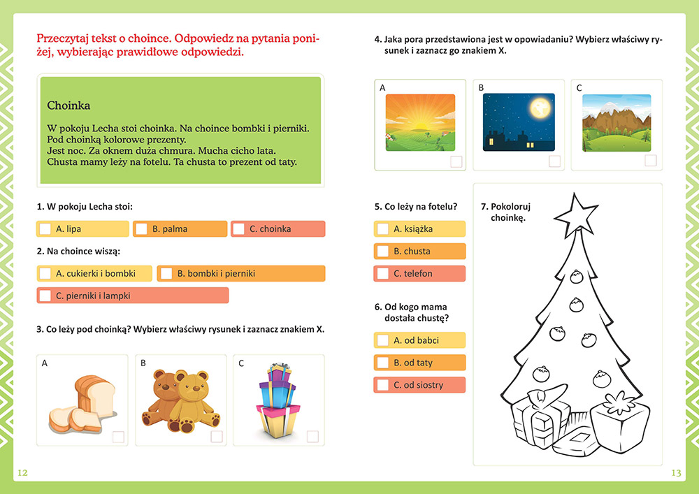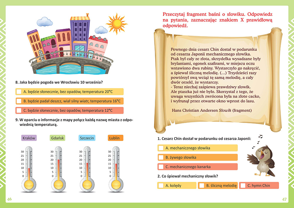 Zadania s± oparte na znanych utworach literackich czy sytuacjach zwi±zanych z codzienno¶ci± dziecka, pomagaj± kszta³towaæ umiejêtno¶æ rozumienia tekstu. Æwiczenia ucz± wy³apywaæ informacje z tre¶ci, s± ciekawe, bardzo kolorowe i dobrze dopracowane.