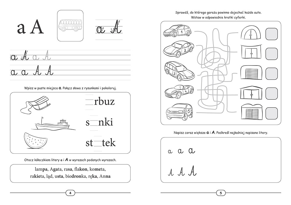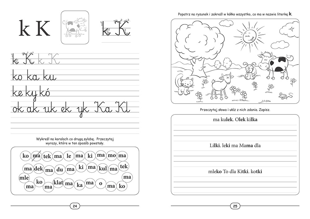 Jest to jedyna książeczka, która uczy jednocześnie czytać i pisać - to absolutna nowość na rynku wydawniczym! Wielkość i kształt liter, liniatura, kolejność prezentowania kolejnych liter są dokładnie takie, jak w szkole. W książce pokazany jest precyzyjnie sposób pisania każdej litery, zostawiono dużo miejsca do samodzielnego ćwiczenia. Dodatkowym atutem są zadania ćwiczące czytanie ze zrozumieniem. Ponadto oprócz nauczania książeczka też bawi, gdyż przy każdej literce są ciekawe zadania, labirynty, rebusy, zagadki. Pracę umilą kolorowe naklejki wielokrotnego użytku!