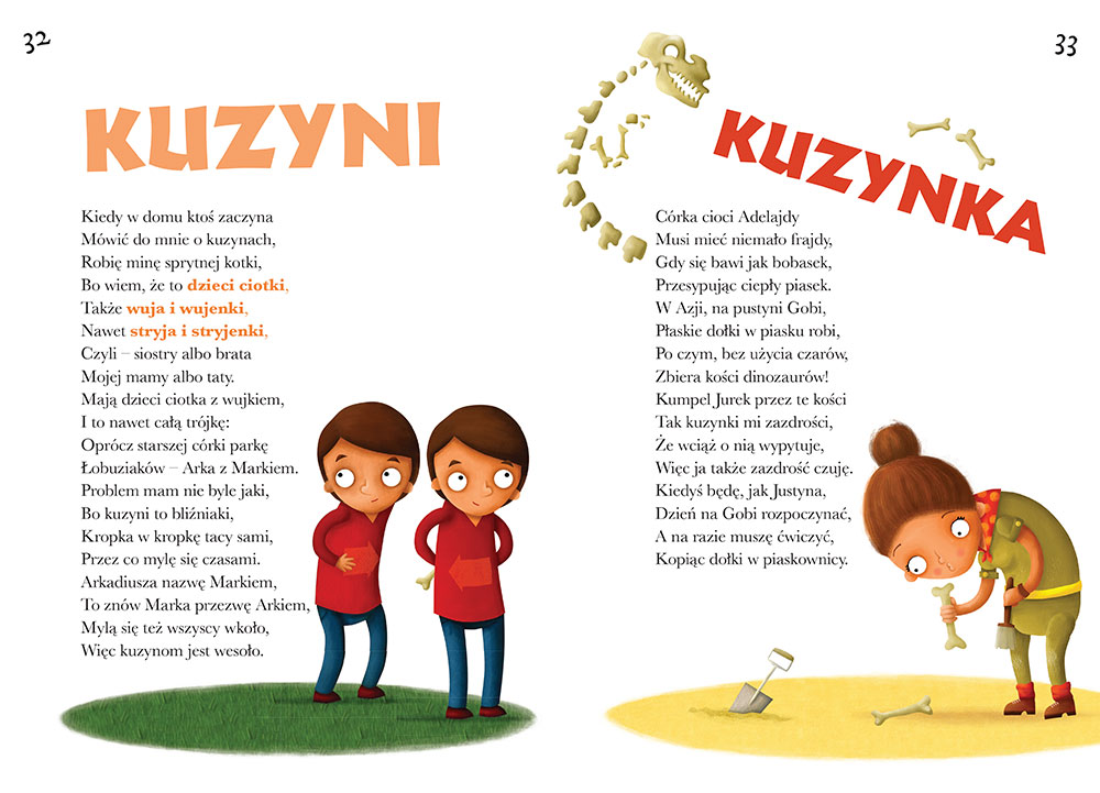 Ka¿de pojêcie wyja¶nione jest za pomoc± zabawnego wiersza, a ca³o¶ci towarzyszy przepiêkne narysowane drzewo genealogiczne, które mo¿e byæ inspiracj± dla malucha, by spróbowa³ stworzyæ takie drzewo dla w³asnej rodziny. Gor±co zachêcamy do wspólnej lektury z dzieckiem!