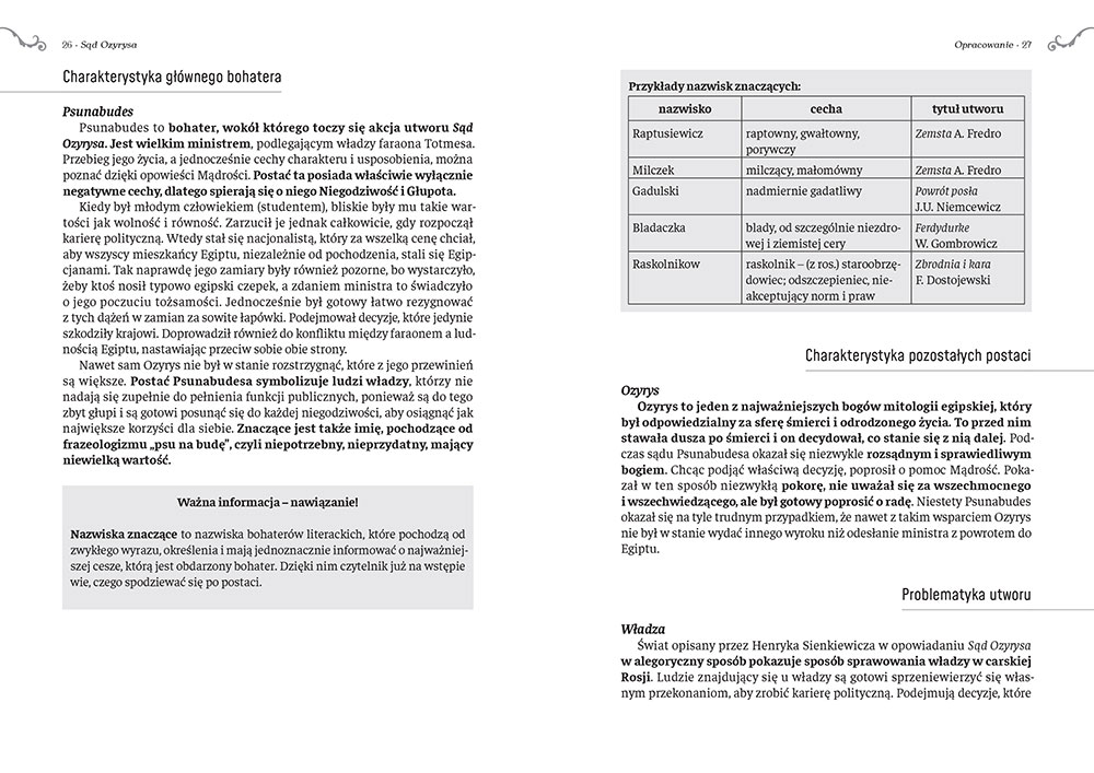 Wydanie Sądu Ozyrysa kompletne bez skrótów i cięć w treści. W tym wydaniu znajdziesz odpowiedzi na pytania z podręcznika - „pewniak na teście”, czyli wskazanie zagadnień, które zwykle pojawiają się w pytaniach z danej lektury we wszelkich testach sprawdzających wiedzę, a także w podręcznikach i na klasówkach. Książka zawiera pełen tekst lektury. Na końcu książki zamieszczono opracowanie, w którym znajduje się bardzo szczegółowe streszczenie oraz drugie skrócone, ułatwiające szybkie przygotowanie się przed lekcją. Opracowanie zawiera ponadto plan wydarzeń, wnikliwie wyjaśnioną problematykę oraz szerokie charakterystyki bohaterów.