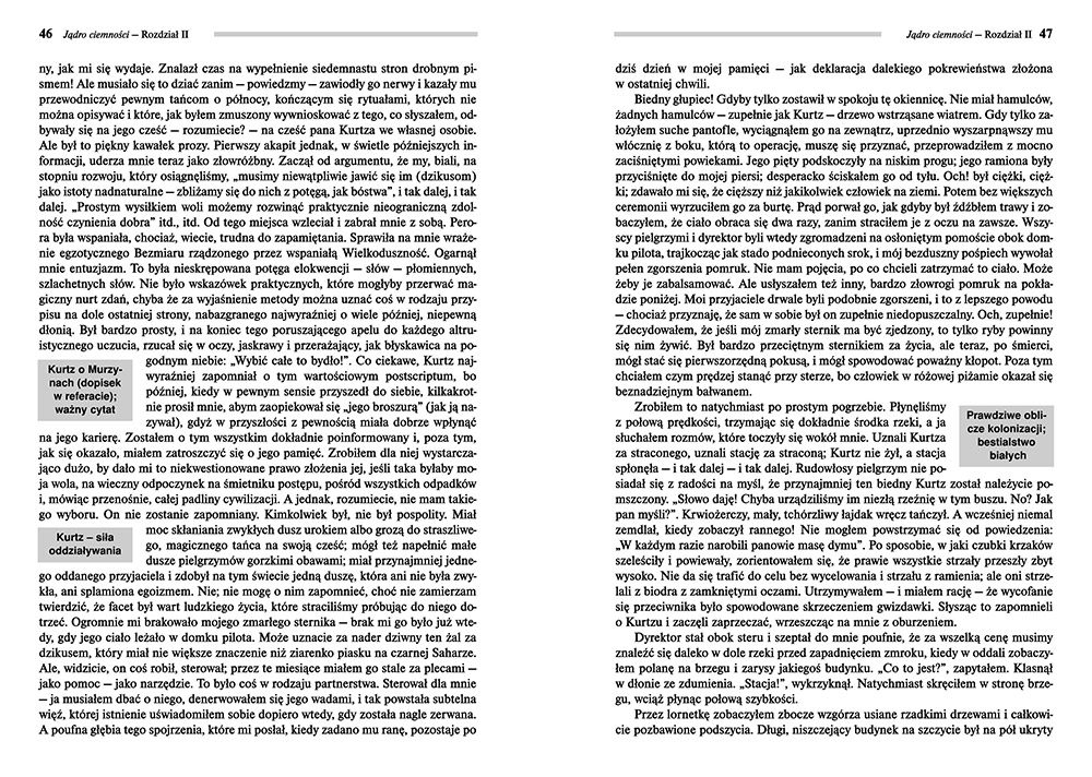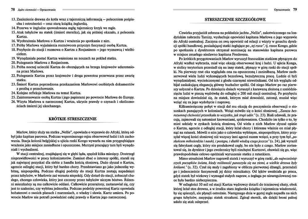 Wydanie Jądra ciemności kompletne bez skrótów i cięć w treści. W tym wydaniu znajdziesz odpowiedzi na pytania z podręcznika - „pewniak na teście”, czyli wskazanie zagadnień, które zwykle pojawiają się w pytaniach z danej lektury we wszelkich testach sprawdzających wiedzę, a także w podręcznikach i na klasówkach. Książka zawiera pełen tekst lektury. Na końcu książki zamieszczono opracowanie, w którym znajduje się bardzo szczegółowe streszczenie oraz drugie skrócone, ułatwiające szybkie przygotowanie się przed lekcją. Opracowanie zawiera ponadto plan wydarzeń, wnikliwie wyjaśnioną problematykę oraz szerokie charakterystyki bohaterów.