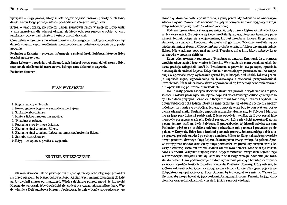 Wydanie Króla Edypa kompletne bez skrótów i cięć w treści. W tym wydaniu znajdziesz odpowiedzi na pytania z podręcznika - „pewniak na teście”, czyli wskazanie zagadnień, które zwykle pojawiają się w pytaniach z danej lektury we wszelkich testach sprawdzających wiedzę, a także w podręcznikach i na klasówkach. Książka zawiera pełen tekst lektury. Na końcu książki zamieszczono opracowanie, w którym znajduje się bardzo szczegółowe streszczenie oraz drugie skrócone, ułatwiające szybkie przygotowanie się przed lekcją. Opracowanie zawiera ponadto plan wydarzeń, wnikliwie wyjaśnioną problematykę oraz szerokie charakterystyki bohaterów.