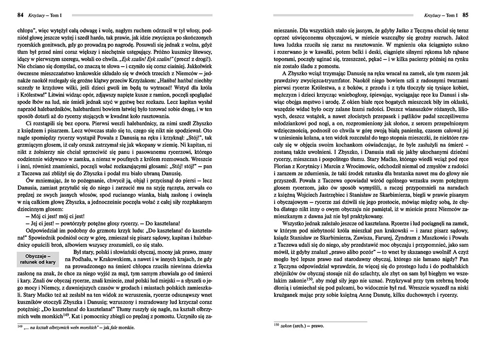 Postaci przedstawione w książce są niezwykle barwne, charyzmatyczne i wyraziste. I nie piszę tu tylko o głównych bohaterach, ale także o postaciach pojawiających się tylko przez chwilę. Autor dobrze przedstawił klimat tamtych czasów, mamy sporo archaizmów i opisów zwyczajów panujących w średniowieczu (...) "Krzyżacy" z serii Lektura z opracowaniem to doskonała propozycja dla uczniów. Znajdziemy tu pełną wersję lektury oraz szczegółowe opracowanie (...). Bardzo pomocne są liczne komentarze umieszczone na marginesie tekstu, które wskazują najważniejsze fragmenty utworu. Bez tego czytając powieść musielibyśmy nieustannie przerywać i robić notatki, aby później móc szybko odnaleźć interesujący nas fragment.
