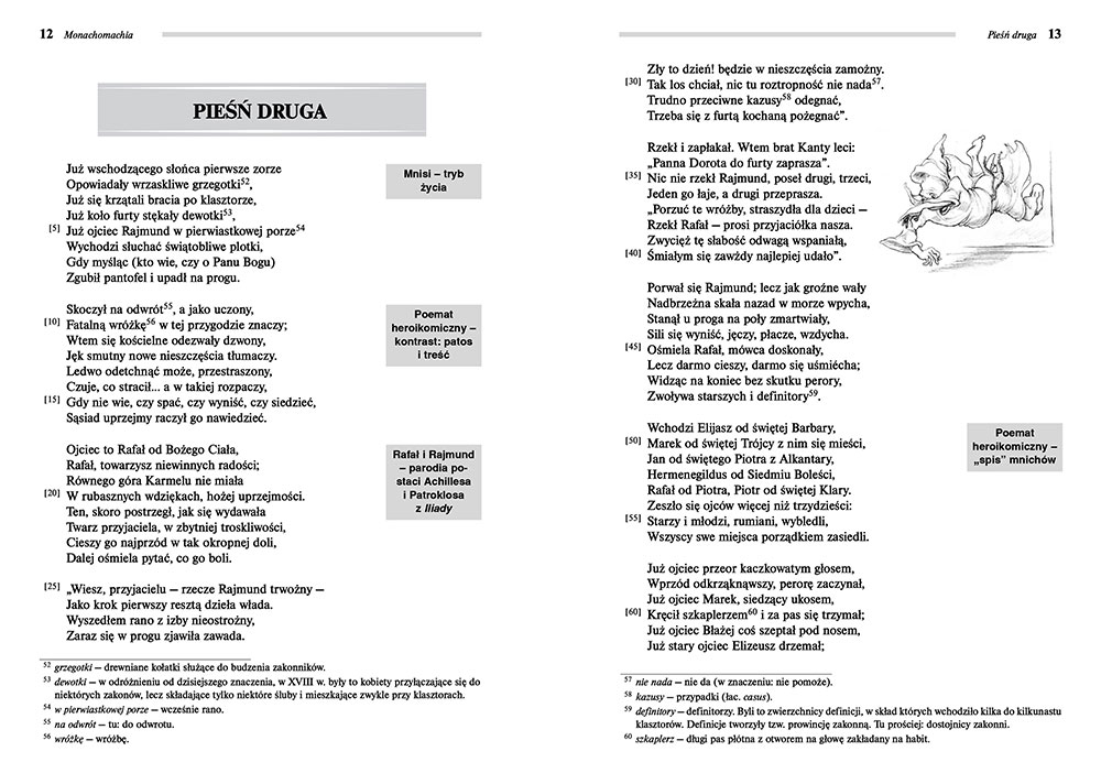 Monachomachia, czyli wojna mnichów to poemat heroikomiczny autorstwa Ignacego Krasickiego, jednego z najbardziej znanych polskich twórców i niezrównanego satyryka. Poemat heroikomiczny to gatunek, którego komizm wynika z zestawienia wzniosłej, pełnej powagi i patosu formy literackiej z błahym i śmiesznym tematem. Tak jest i w tym przypadku - językiem wywodzącym się z eposu homeryckiego autor opisuje bijatykę pijanych mnichów. Utwór jest pełną ironicznego humoru satyrą na stan duchowny, ale też na ogół wad społecznych, jakie autor dostrzegał wokół siebie.