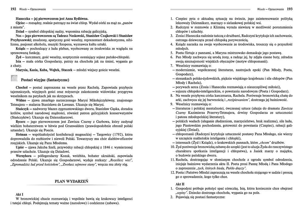 Wydanie Wesela kompletne bez skrótów i cięć w treści. W tym wydaniu znajdziesz odpowiedzi na pytania z podręcznika - „pewniak na teście”, czyli wskazanie zagadnień, które zwykle pojawiają się w pytaniach z danej lektury we wszelkich testach sprawdzających wiedzę, a także w podręcznikach i na klasówkach. Książka zawiera pełen tekst lektury. Na końcu książki zamieszczono opracowanie, w którym znajduje się bardzo szczegółowe streszczenie oraz drugie skrócone, ułatwiające szybkie przygotowanie się przed lekcją. Opracowanie zawiera ponadto plan wydarzeń, wnikliwie wyjaśnioną problematykę oraz szerokie charakterystyki bohaterów.