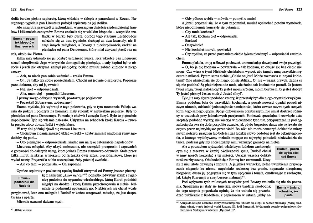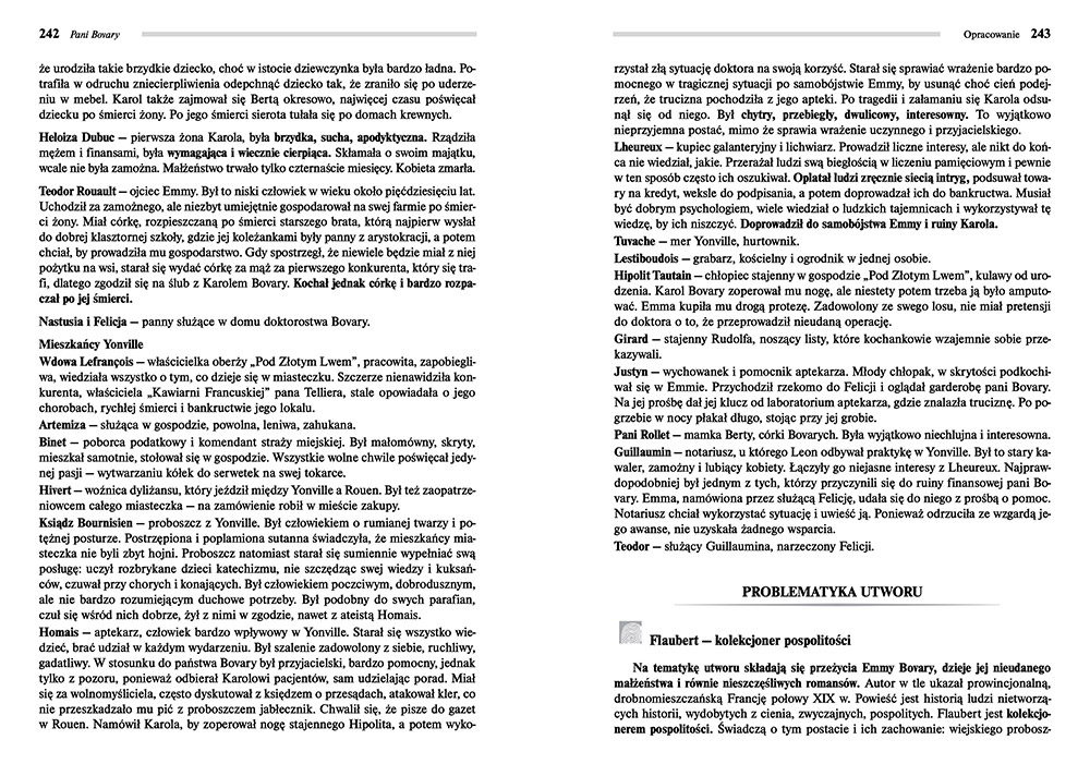 Wydanie Pani Bovary kompletne bez skrótów i cięć w treści. W tym wydaniu znajdziesz odpowiedzi na pytania z podręcznika - „pewniak na teście”, czyli wskazanie zagadnień, które zwykle pojawiają się w pytaniach z danej lektury we wszelkich testach sprawdzających wiedzę, a także w podręcznikach i na klasówkach. Książka zawiera pełen tekst lektury. Na końcu książki zamieszczono opracowanie, w którym znajduje się bardzo szczegółowe streszczenie oraz drugie skrócone, ułatwiające szybkie przygotowanie się przed lekcją. Opracowanie zawiera ponadto plan wydarzeń, wnikliwie wyjaśnioną problematykę oraz szerokie charakterystyki bohaterów.