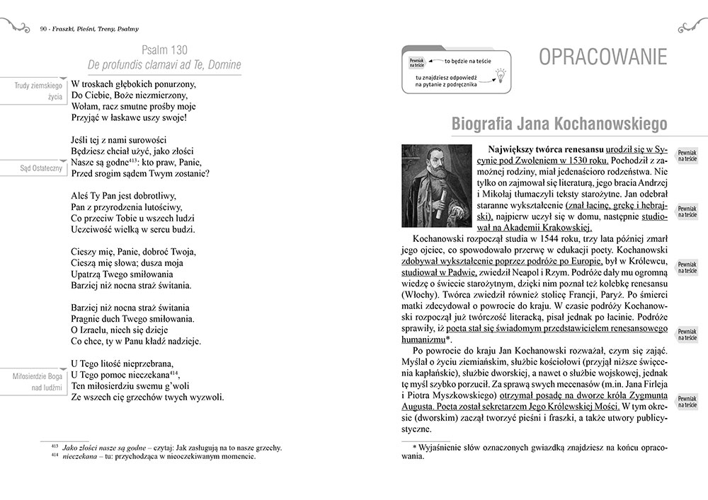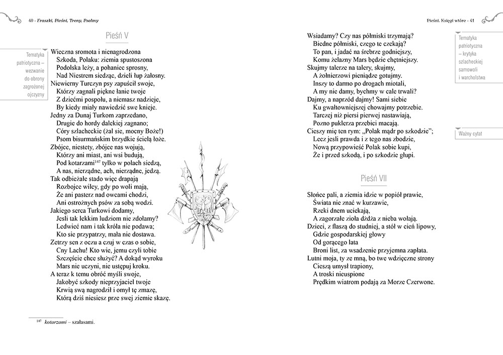 Wydanie Fraszek, Pieśni, Trenów kompletne bez skrótów i cięć w treści. W tym wydaniu znajdziesz odpowiedzi na pytania z podręcznika - „pewniak na teście”, czyli wskazanie zagadnień, które zwykle pojawiają się w pytaniach z danej lektury we wszelkich testach sprawdzających wiedzę, a także w podręcznikach i na klasówkach. Książka zawiera pełen tekst lektury. Na końcu książki zamieszczono opracowanie, w którym znajduje się bardzo szczegółowe streszczenie oraz drugie skrócone, ułatwiające szybkie przygotowanie się przed lekcją. Opracowanie zawiera ponadto plan wydarzeń, wnikliwie wyjaśnioną problematykę oraz szerokie charakterystyki bohaterów.